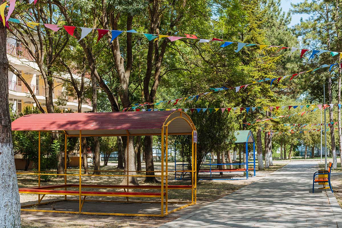 Корпус «Солнечный» затерялся в зелени южных деревьев в северной части санатория. Все самые интересные мероприятия у детей как на ладони, ведь окна корпуса выходят на стадион Антей.